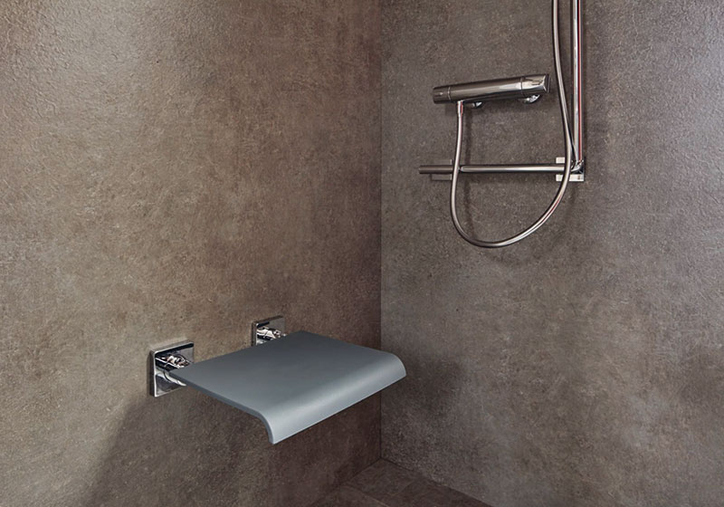 Eine befahrbare Dusche mit platzsparendem Duschsitz zum Ausklappen und Haltegriffen zum Festhalten.